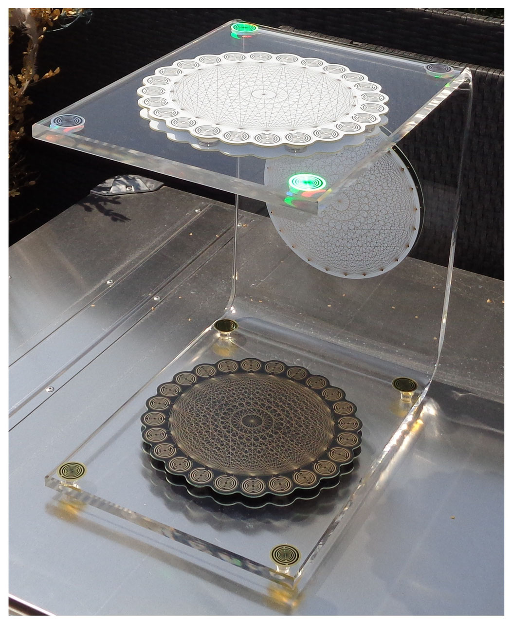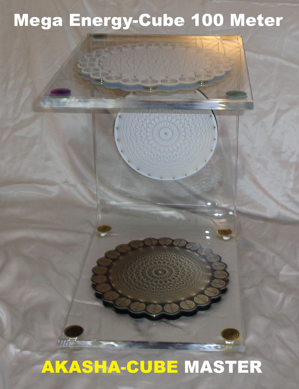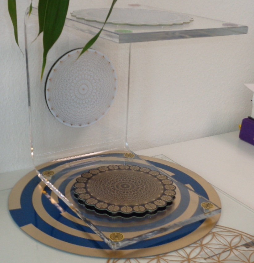 Akrylglas, Breite 270 mm x Höhe 400 mm x Tiefe 400 mm ca. 12 Liter Ladevolumen: Scheiben: 2 x Matrix-MWO-Disc weiß/Gold 200 mm mit geometrischen Symbolen // 2 x Matrix-Tesserakt Scheibe weiß 240 mm // 2 x Matrix-Tesserakt Scheibe schwarz 240 mm und 8 x Quanten-Hologramm-Chips // insgesamt 40 spezielle Magneten- und speziellen Lichtquanten-Resonanz-Chips sowie einer eingebauten Hologramm-Technik.